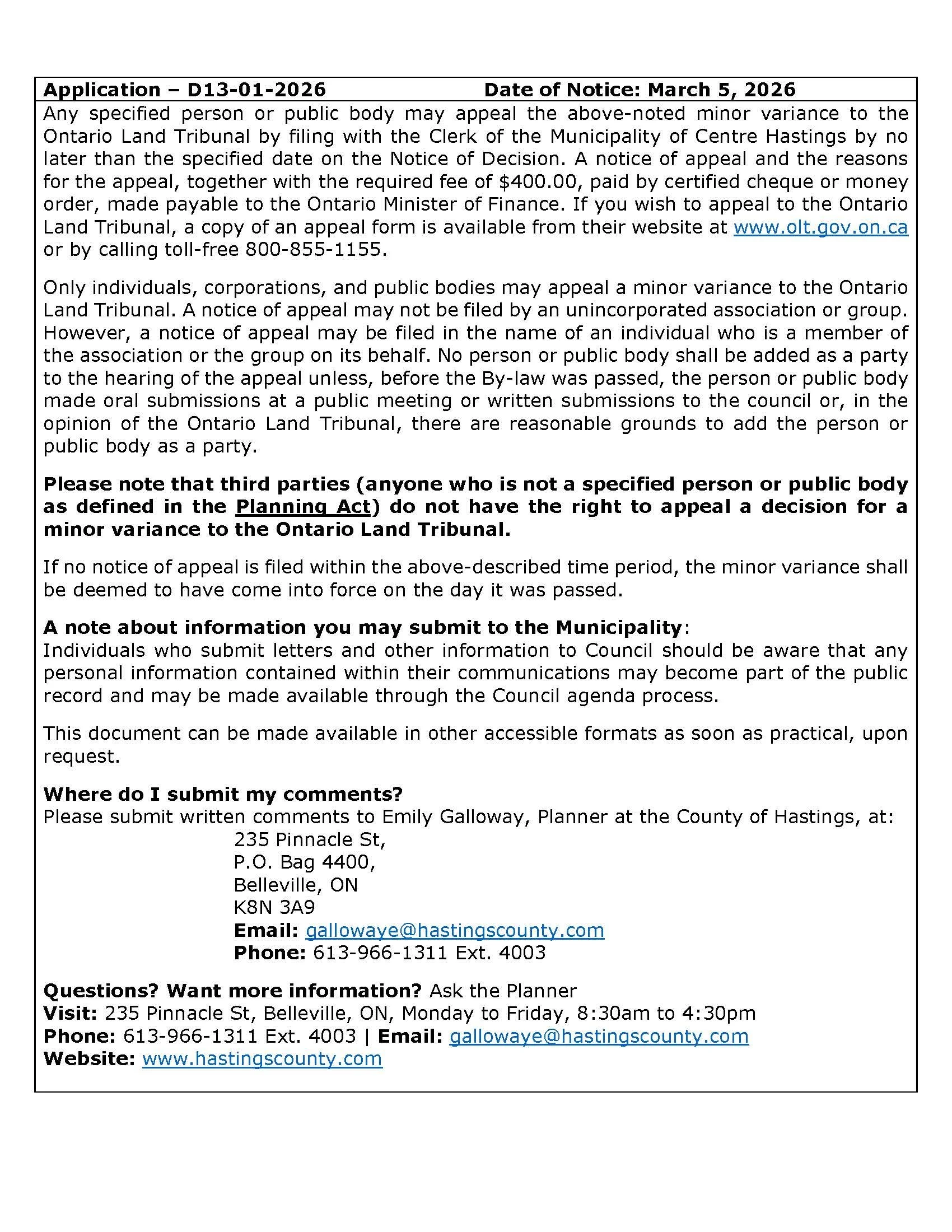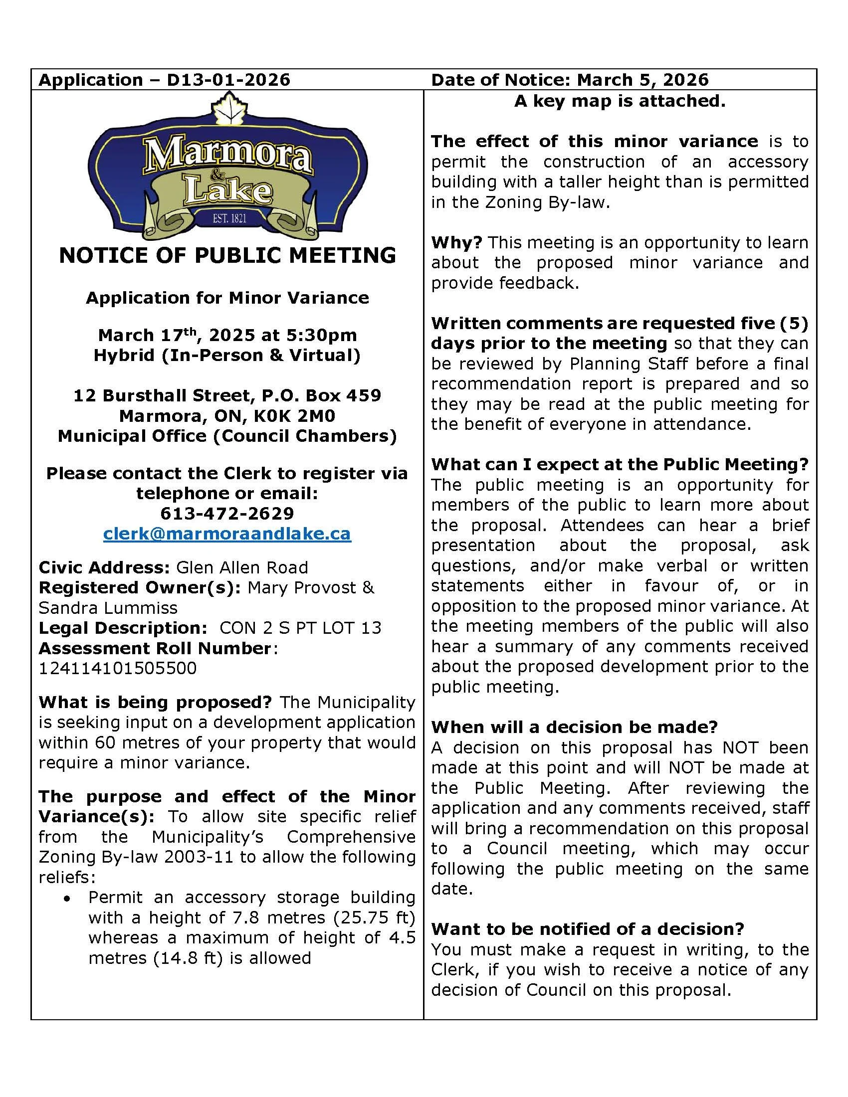 Notice of Public Meeting for a Minor Variance Application D13-01-2026 Kristen McConnellMarch 4, 2026 Facebook0 0 Likes